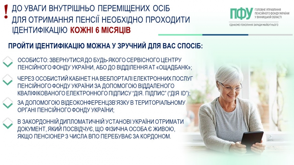 Головне управління Пенсійного фонду України у Вінницькій області, повідомляє що особи, які до 24 лютого 2022 року набули статусу ВПО, зобов’язані проходити фізичну ідентифікацію кожні 6 місяців з дня проведення попередньої ідентифікації.