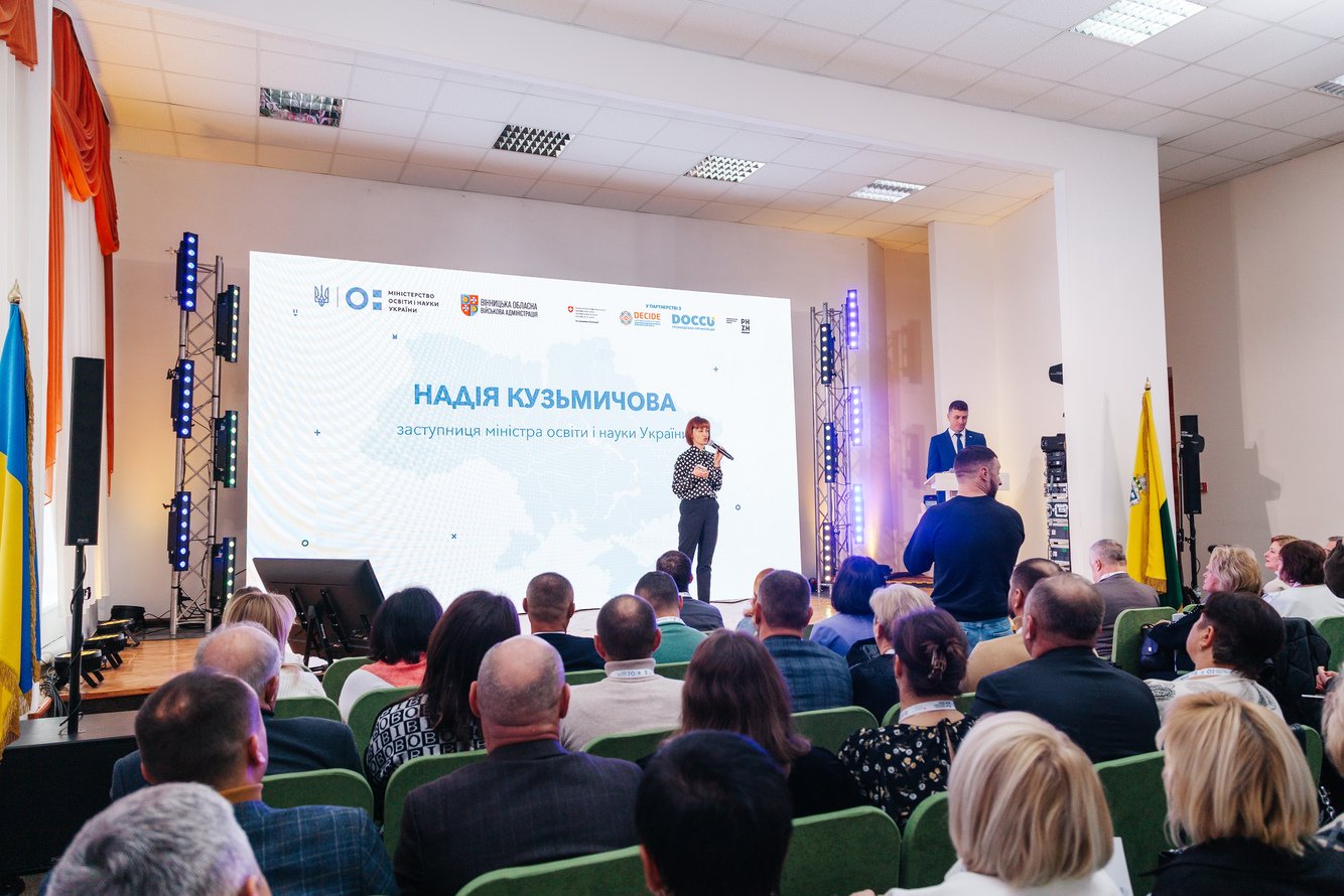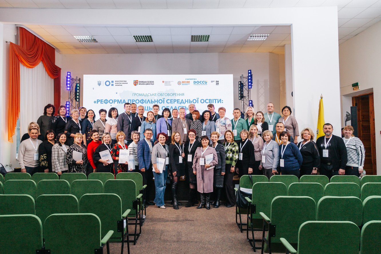 Громадське обговорення реформи старшої школи відбулося у Вінниці. У ньому взяли участь: Оксен Лісовий, міністр освіти і науки України; Надія Кузьмичова, заступниця міністра освіти і науки України; Валентина Полторак, менеджерка Проєкту DECIDE, заступниця голови ГО DOCCU; Володимир Буняк, директор департаменту гуманітарної політики Вінницької ОДА.