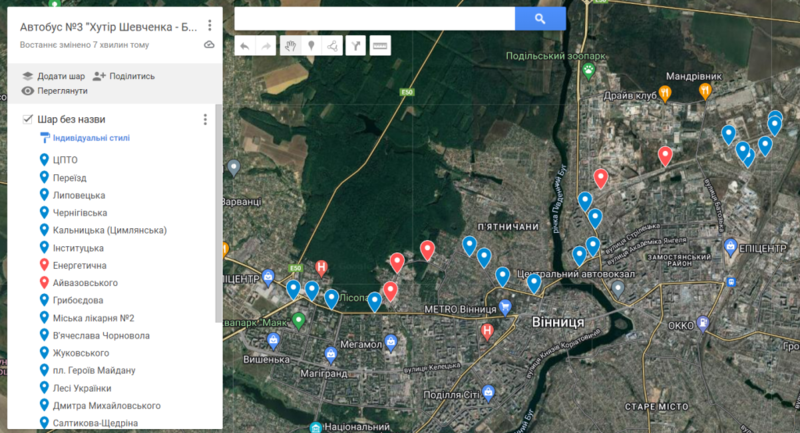 Запропонований маршрут відмічений на мапі Google з зупинками, де червоним кольором позначені ті, які треба буде облаштувати, якщо він з'явиться.
