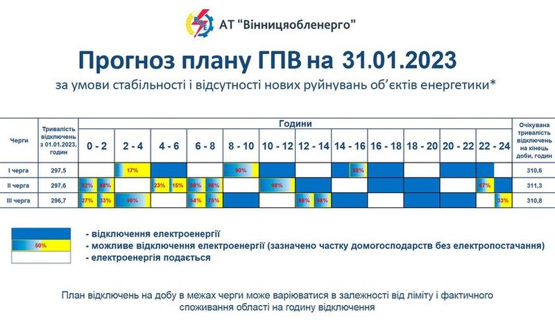 «Відповідно до доведених лімітів НЕК "УКРЕНЕРГО" на 31.01.23 р. по Вінницькій області задіяно рівномірне обмеження електропостачання відповідно до графіка погодинного відключення.